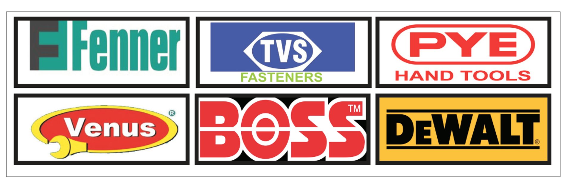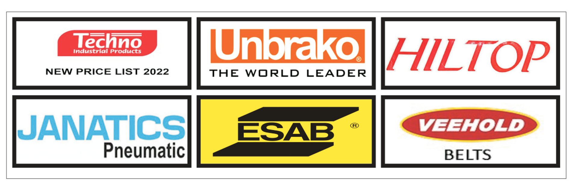 ESAB/ADVANI/ASHA-WELDING EQUIPMENTS / HILLTOP/VEERA-ANCHOR FASTENER / TVS/UNBRAKO-HIGH TENSILE / BOSS/NOVA-IBR VALVE FENNER/VEEHOLD-V BELTS / GOLD-OIL & U SEAL / NITRILE/SILICON-RUBBER SHEET / JANATICS/TECHNO-PNEUMATIC ITEMS / KARAM/STANLEY-SAFETY PRODUCTS